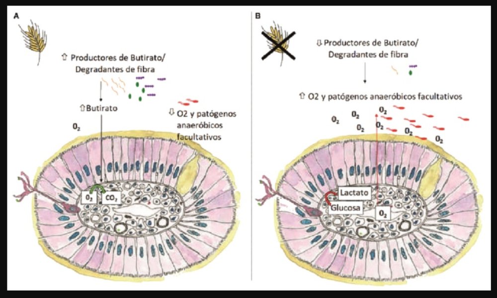 Figura 01. Corte transversal de las vellosidades intestinales en presencia o ausencia de fibra alimentaria. (A)La inclusión de fibra alimentaria ayuda a mantener la homeostasis intestinal y mejora la resistencia a las enfermedades, manteniendo un ambiente con baja concentración de oxígeno. La fibra dietética facilita la expansión de microorganismos productores AGV (en especial butirato), que posteriormente aumenta las concentraciones de butirato, reduciendo el oxígeno luminal y limitando la expansión de patógenos anaeróbicos facultativos. (B)Alternativamente, en ausencia de fibra en la dieta, los agentes patógenos anaeróbicos facultativos, incluyendo ciertas especies de E. coli y Salmonella sp., pueden expandir a las costas de los productores de butirato. En la ausencia de butirato, los enterocitos usan la glucólisis anaeróbica para obtener energía, un proceso que aumenta las concentraciones de oxígeno epitelial, creando un nicho favorable para patógenos facultativos, como Salmonella, florecer. Fuente: Jha et al. (2019)