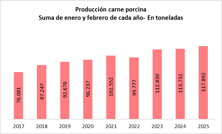 Para los dos primeros meses del 2025 la producción de carne de cerdo alcanzó un récord histórico, llegando a las 117 892 toneladas producidas (SAGyP). Si bien la producción del primer bimestre viene creciendo año a año, 2025 marcó un récord desde 2017, superando los 115 000 toneladas. Frente al año 2024, la producción creció un 3,7%.