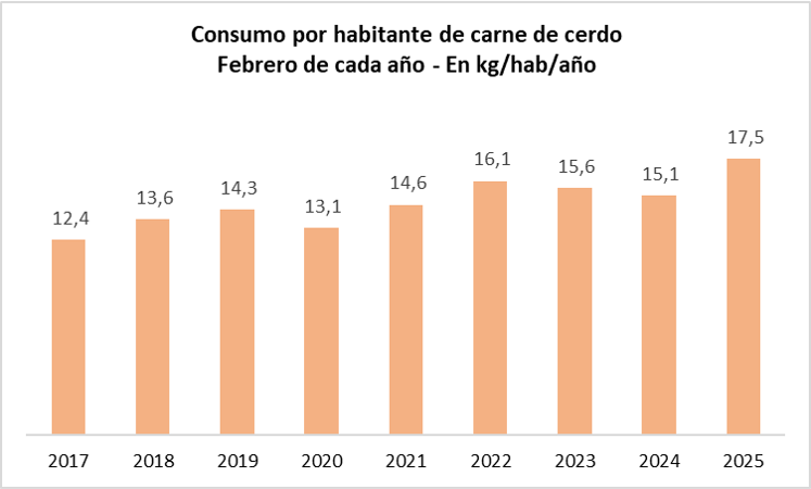 Por su parte, el consumo muestra un comportamiento similar. En febrero 2025 alcanzó los 17,5 kilos por habitante, lo que es 800 gramos más que enero 2025 y 5 kilos más que en febrero del 2024, marcando otro hito si miramos el consumo de los meses de febrero, desde el 2017. En términos relativos, desde enero y hasta los registros de marzo 2025, la carne vacuna se viene encareciendo frente al cerdo, aumentando la relación asado/cerdo, volviéndolo una alternativa para el consumo. En febrero, el precio del cerdo aumentó 0,3 % y la carne vacuna 2,7 %, respecto a enero. En este sentido, la carne de cerdo se consolida cada vez más en la dieta de los argentinos.