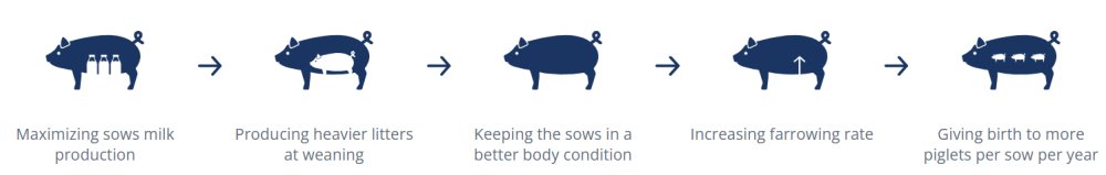 - Higher farrowing rate. A better body condition throughout the process naturally leads to a higher number of piglets at the next farrowing.