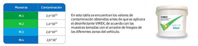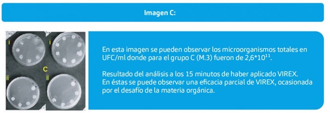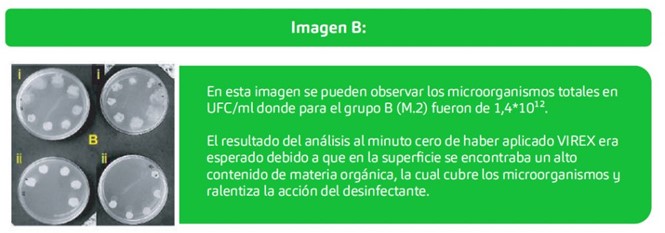 VIREX con un tempo di contatto di 30 minuti in presenza di un alto contenuto di sostanza organica ha ottenuto una riduzione del 100% di microrganismi, come si osserva dall’immagine sottostante.