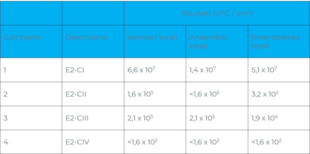 Come si può osservare in tabella, i Sali quaternari d’ammonio hanno determinato una riduzione nella conta dei microrganismi, senza però eliminarli completamente.