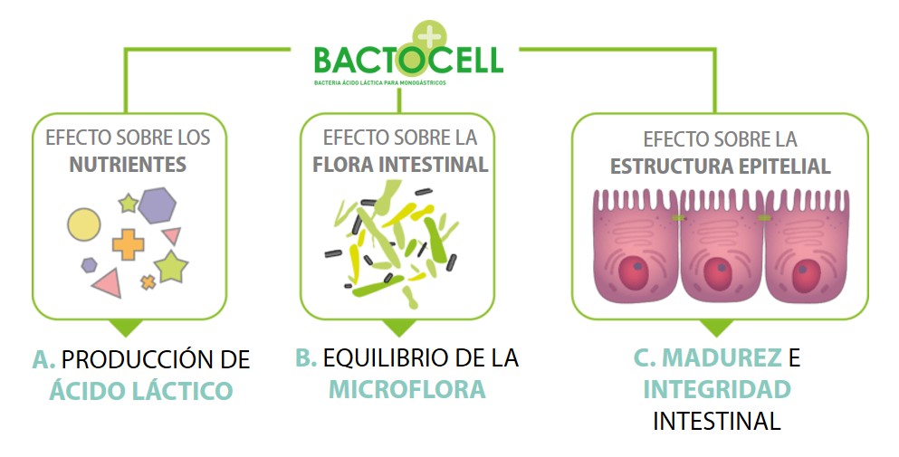 - BACTOCELL mejora la población intestinal de bacterias ácido-lácticas y favorece el desarrollo de las bacterias comensales positivas (Lactobacillus) reforzando la salud intestinal.