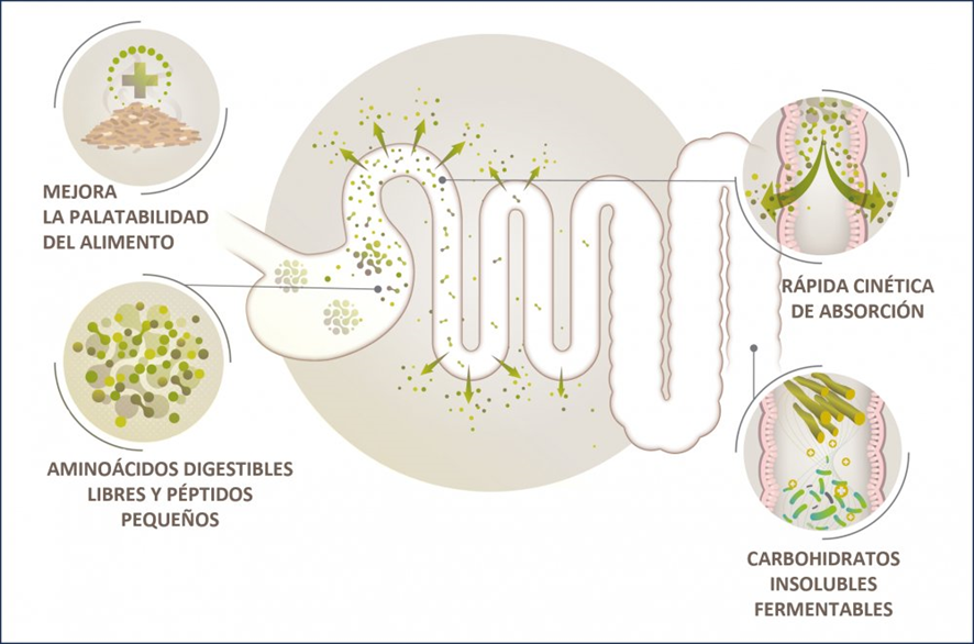 - En el intestino delgado: Proteínas altamente digeribles, alto nivel de aminoácidos digestibles libres y pequeños péptidos; temprana y rápida cinética de absorción de aminoácidos.