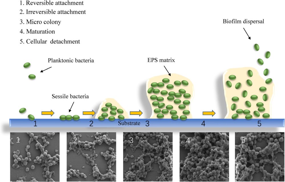 I biofilm batterici sono comunità microbiche adese ad una superficie inerte o ad un tessuto e sono racchiuse all’interno di una matrice complessa. La loro formazione prevede diverse fasi: i batteri “liberi” si attaccano in modo reversibile ad una superficie, formano una microcolonia e producono una matrice polimerica attorno al biofilm. Una volta stabilito, il biofilm può liberare singole cellule batteriche per colonizzare altre nicchie dove possono formarsi nuovi biofilm.