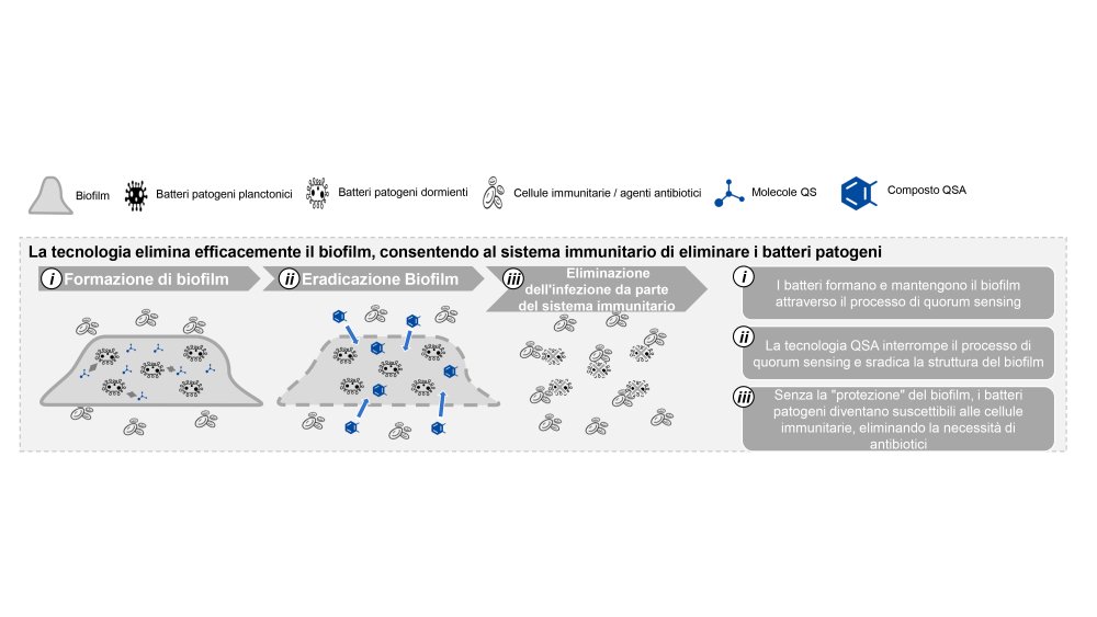 Nell’ambito della ricerca volta ad individuare, selezionare, purificare e concentrare QSI di origine naturale, è stata sviluppata e brevettata, da parte di un nostro partner internazionale, una particolare tecnologia denominata QSA. La tecnologia QSA riduce la necessità di dovere ricorrere agli antibiotici per una serie di infezioni animali, alterando il biofilm batterico mediante l’impiego di molecole vegetali selettive.