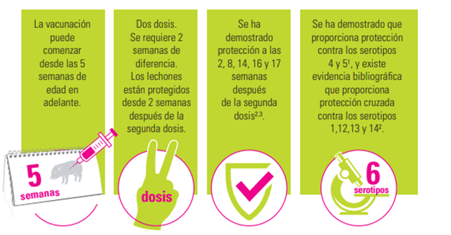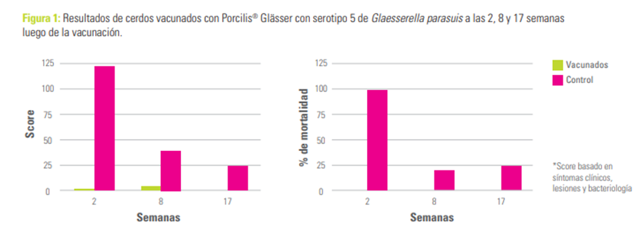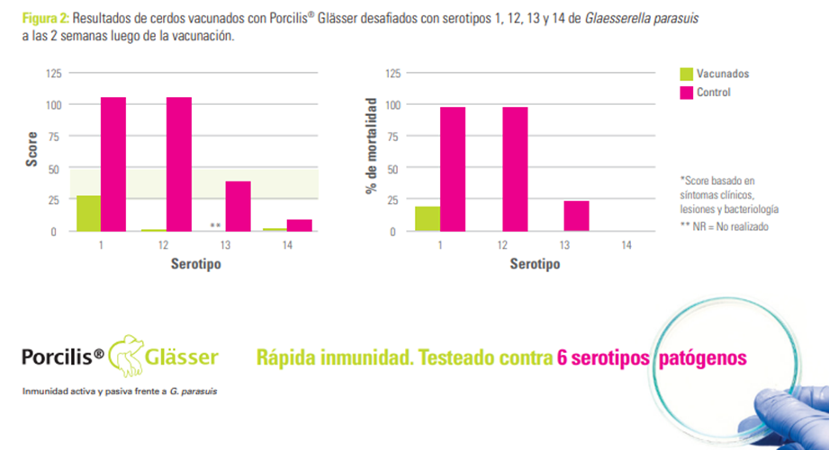 Actualmente, mezclar cerdos de diferentes orígenes sumado a infecciones concurrentes son factores clave para su diseminación. Entre los 15 serotipos conocidos, el serotipo 5 de Glaesserella parasuis es el que se aísla con mayor frecuencia. Porcilis® Glässer, formulado con el serotipo 5 y Diluvac Forte, ha demostrado que proporciona protección contra los serotipos 4 y 5¹, y existe evidencia bibliográfica que proporciona protección cruzada contra los serotipos 1,12,13 y 14².