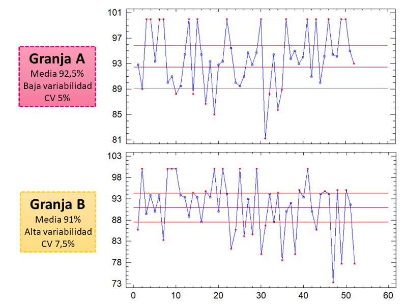 En la siguiente imagen se muestran dos granjas con una media de tasa de parto similar (92.5 y 91 %) pero con una variabilidad bastante diferente. En la Granja A se observa un proceso más estable (mayor cantidad de puntos azules cercanos a la media), esto supone ventajas productivas, económicas y financieras ya que cuenta con un flujo de partos predecible. Por el contrario, la Granja B es muy inestable (mayor cantidad de puntos rojos por encima del objetivo o por debajo del límite de intervención) en esta granja es muy difícil saber cuál será la tasa de parición en la próxima semana no pudiendo planificar hacia adelante cuantos partos tendrá la empresa en un periodo determinado, esto demuestra que el plan de trabajo necesita ajustes.