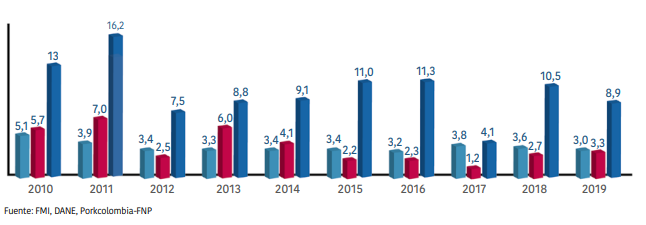 Crecimiento sector de producción de carnes de cerdo en Colombia vs crecimiento económico nacional y mundial (%) 2010 - 2019