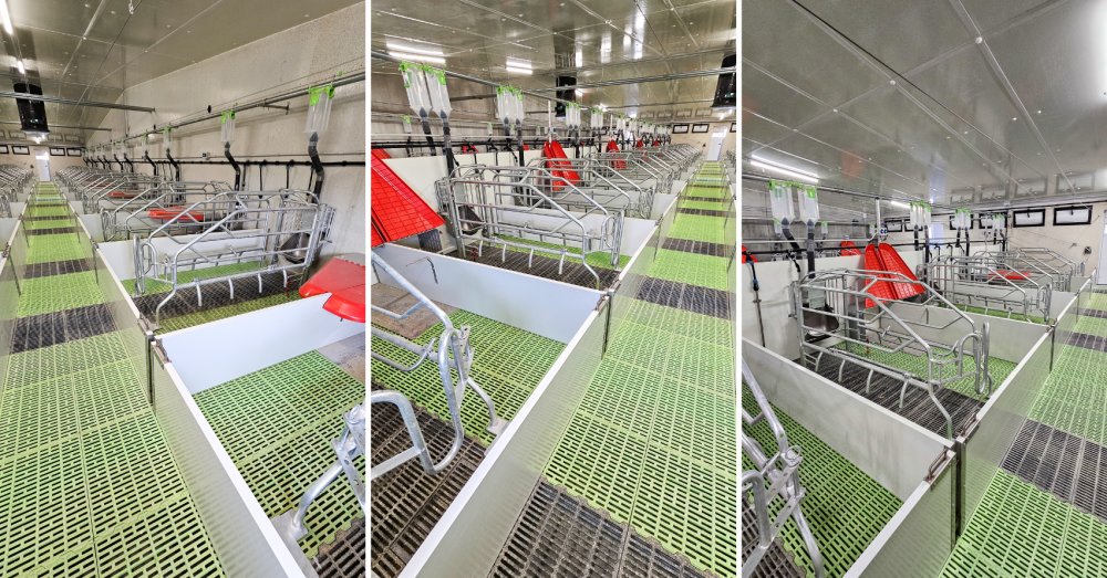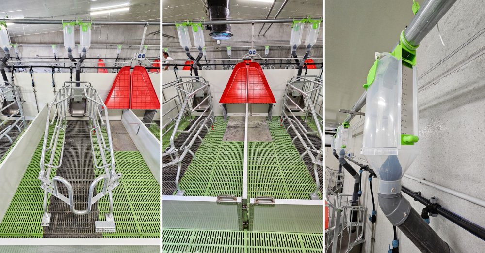 En este proyecto hemos suministrado todos los interiores: jácenas de hormigón, viguetas de fibra de vidrio, slats de plástico, separadores de PVC, postes de acero inoxidable, parideras galvanizadas, dosificadores manuales, comederos, bebederos para cerdas y lechones, nidos y placas de calefacción. Todo ha sido posible gracias a una combinación de fabricación propia, proveedores especializados e importación.