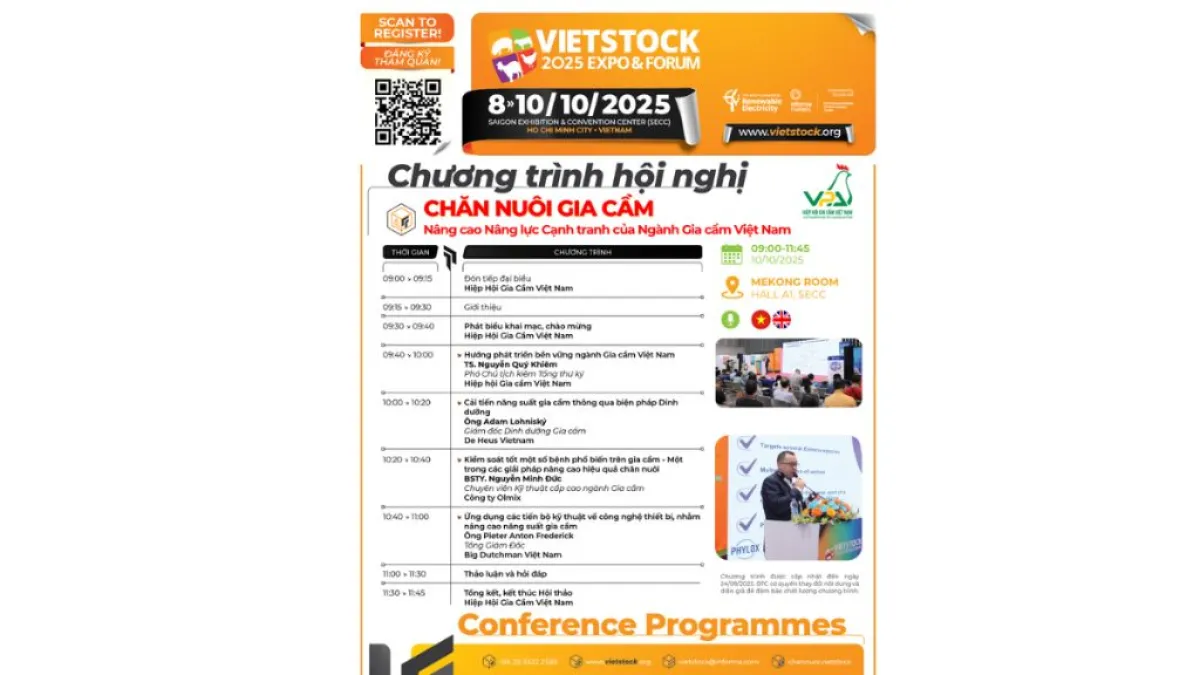 Vào 9h sáng ngày 10/10 sắp tới tại Phòng Hội nghị Mekong nhà A1, Hiệp hội Gia cầm Việt Nam (VPA) sẽ chia sẻ về việc “Nâng cao năng lực cạnh tranh của ngành Gia cầm Việt Nam” trong buổi Hội nghị chuyên ngành nhằm cung cấp những tri thức giá trị cho ngành chăn nuôi Việt Nam.