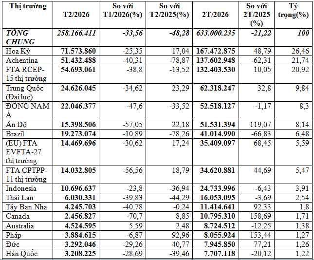 Hoa Kỳ là thị trường cung cấp lớn nhất, chiếm 26,5% với 167,47 triệu USD, tăng mạnh 48,79%. Ngược lại, Argentina đứng thứ hai nhưng giảm sâu 62,3%, còn 137,6 triệu USD. Trung Quốc xếp thứ ba với 62,32 triệu USD, tăng 32,8% so với cùng kỳ.