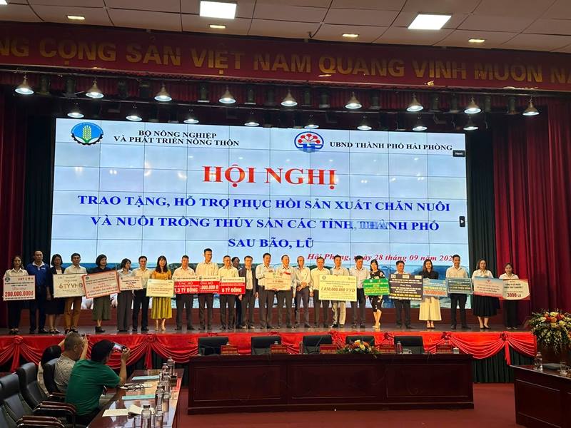 Tại hội nghị, thông qua Bộ NN&PTNT, các doanh nghiệp hoạt động trong lĩnh vực chăn nuôi, thú y trao tặng hỗ trợ người dân bị thiệt hại do bão số 3 bằng tiền mặt, thức ăn, con giống, thuốc, hóa chất, chất xử lý cải tạo môi trường, phao và các vật tư khác với trị giá trên 70 tỷ đồng. Đây là sự chia sẻ quý giá, nguồn kinh phí tự nguyện, thể hiện quyết tâm của các doanh nghiệp với người dân.