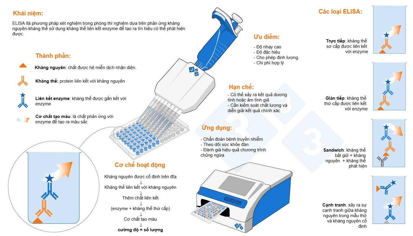 Xét nghiệm hấp thụ miễn dịch liên kết enzyme (ELISA) là một phương pháp dựa trên nguyên tắc liên kết đặc hiệu giữa kháng nguyên và kháng thể, sau đó được phát hiện thông qua phản ứng enzyme, thường là phản ứng tạo màu.