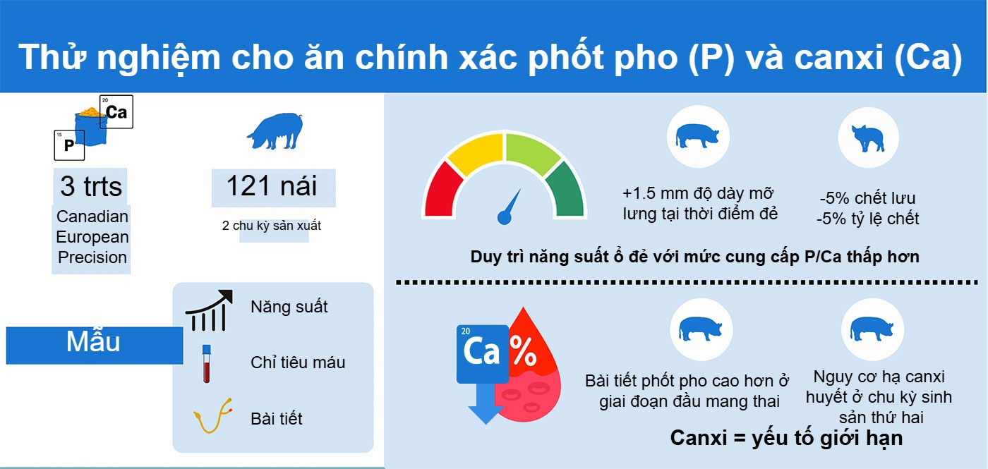 Một hướng chiến lược khác là cho ăn chính xác các khoáng chất như phốt pho (P) và canxi (Ca), được đánh giá thông qua các chỉ số huyết thanh học và bài tiết qua nước tiểu, thực hiện trên 121 heo nái trong hai chu kỳ sinh sản. Các thử nghiệm xác nhận rằng có thể duy trì năng suất ổ đẻ ngay cả khi giảm mức cung cấp P và Ca, đồng thời làm tăng độ dày mỡ lưng tại thời điểm đẻ (+1,5 mm) và giảm 5% tỷ lệ thai chết lưu cũng như tỷ lệ chết. Tuy nhiên, kết quả cũng cho thấy canxi có thể trở thành yếu tố giới hạn, đặc biệt ở chu kỳ sinh sản thứ hai, với nguy cơ hạ canxi huyết nếu quá trình chuyển tiếp sang giai đoạn đẻ không được quản lý phù hợp.