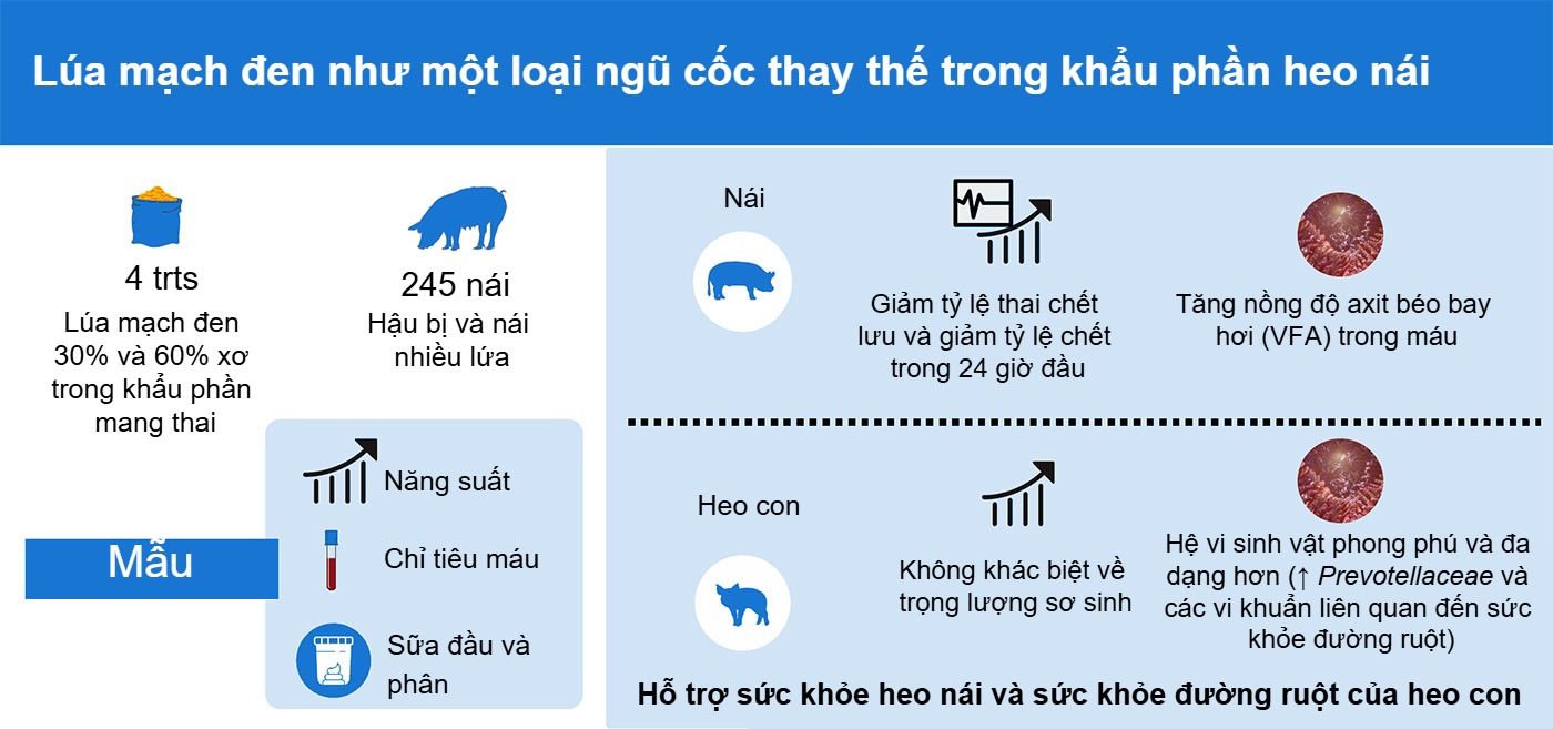 Centre de développement du porc du Québec (CDPQ) cũng đã nghiên cứu các giải pháp thay thế ngũ cốc truyền thống, chẳng hạn như sử dụng lúa mạch đen trong khẩu phần mang thai. Trong các thử nghiệm trên 245 heo nái, lúa mạch đen cho thấy là một lựa chọn khả thi cả về năng suất lẫn sức khỏe, với mối liên quan đến việc giảm tỷ lệ thai chết lưu và giảm tỷ lệ chết trong 24 giờ đầu sau sinh, mà không ảnh hưởng bất lợi đến khối lượng sơ sinh. Ngoài ra, ghi nhận nồng độ axit béo bay hơi trong máu cao hơn, cùng với hệ vi sinh vật đường ruột phong phú và đa dạng hơn ở heo con, cho thấy tiềm năng cải thiện sức khỏe tiêu hóa.