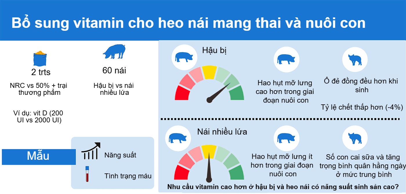 Bổ sung vitamin trong giai đoạn mang thai và nuôi con là một hướng nghiên cứu quan trọng khác. Trong các nghiên cứu trên 60 heo nái, so sánh mức khuyến cáo của NRC với mức tăng thêm 50% (ví dụ so sánh 200 đơn vị quốc tế vitamin D theo khuyến cáo của NRC với 2.000 UI), ghi nhận ổ đẻ đồng đều hơn khi sinh và giảm 4% tỷ lệ chết ở heo nái hậu bị. Kết quả cho thấy nhu cầu vitamin của heo nái hậu bị và heo nái có năng suất sinh sản cao có thể đang bị đánh giá thấp, đặc biệt khi có nhu cầu chuyển hóa cao, mặc dù có sự khác biệt về mức huy động dự trữ cơ thể trong giai đoạn nuôi con.