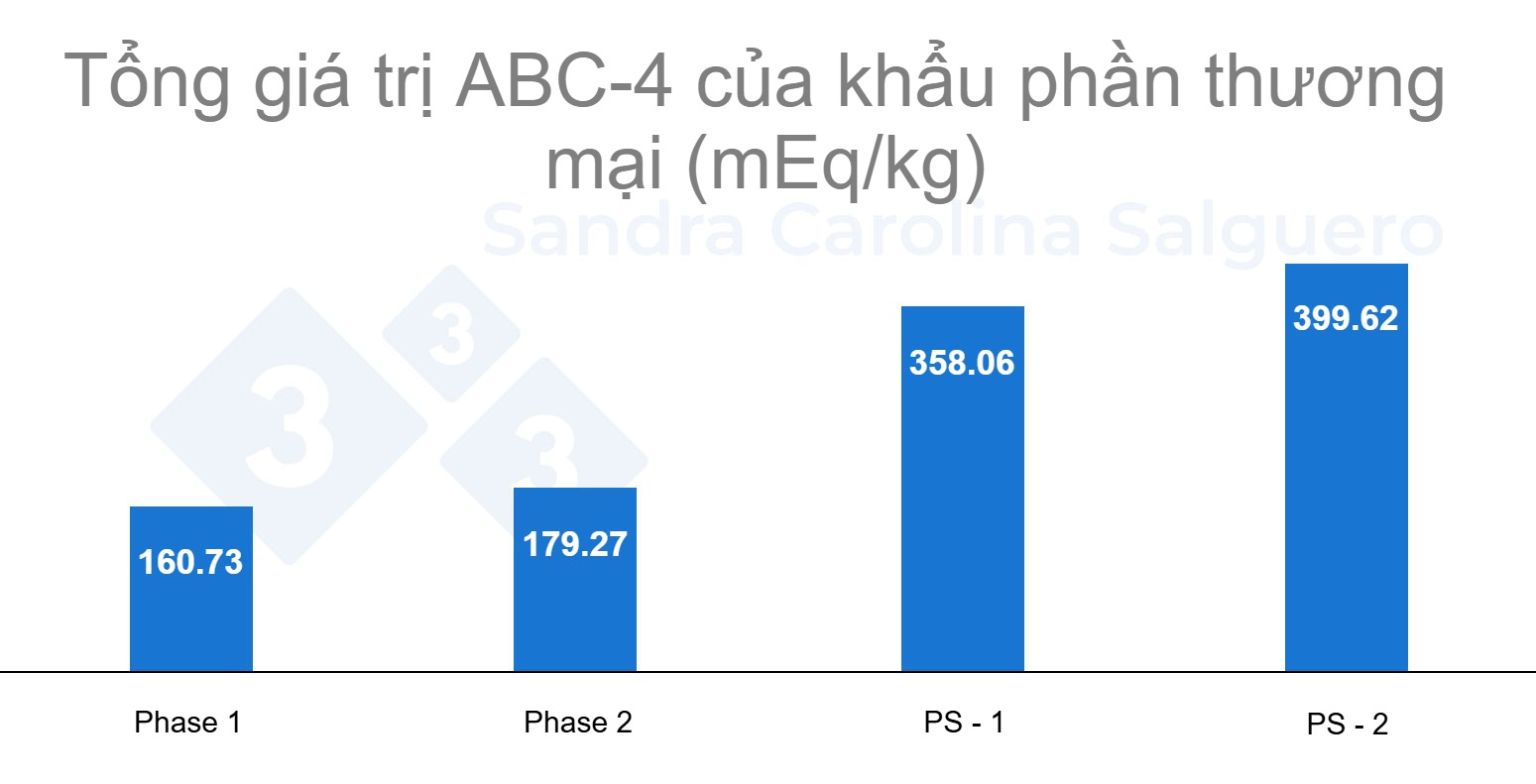 Trong thực tế sản xuất, các giai đoạn đầu sau cai sữa thường sử dụng khẩu phần có ABC-4 thấp (Giai đoạn 1 và Giai đoạn 2), sau đó tăng dần ở các khẩu phần tiền khởi đầu (PS-1 và PS-2) lên mức gần 400 mEq/kg, phản ánh sự thích nghi với sự phát triển của hệ tiêu hóa heo con (Biểu đồ 1)