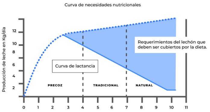 Figura1: Relación entre la producción láctea de cerdas respecto a los requerimientos nutricionales de los lechones desde el nacimiento hasta el destete