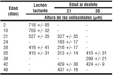 Efecto de la edad al destete sobre la altura de las vellosidades intestinales en lechones. (Argote et al., 2008)