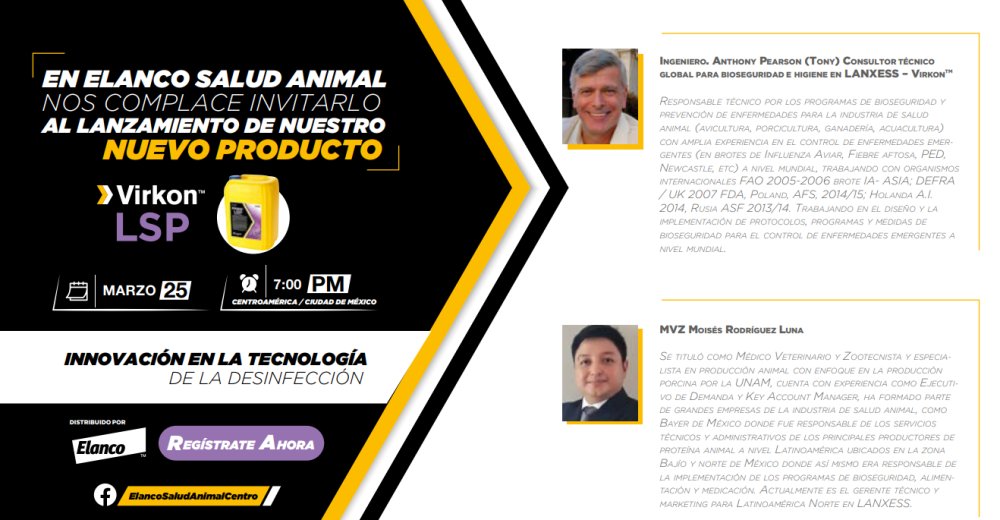 En este evento contaremos con la participación de Anthony Pearson, Ingeniero y Consultor Técnico Global para bioseguridad e higiene en Lanxess - Virkon™ y Moisés Rodríguez Luna, Médico veterinario y zootecnista y especialista en producción animal, actualmente Gerente Técnico y Marketing para Latinoamérica norte en Lanxess.