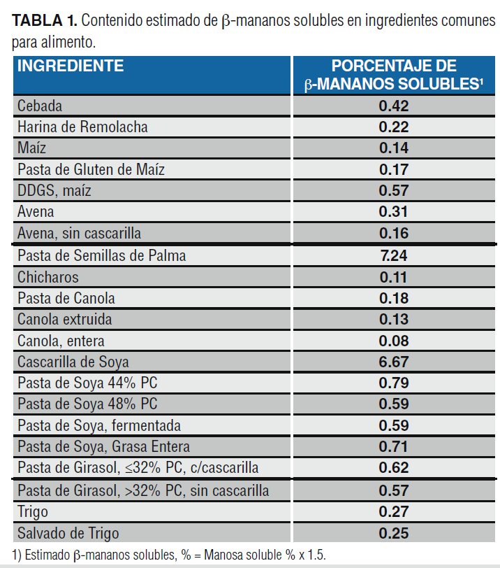 [Karl Poulsen] Los β-Mananos se encuentran en la mayoría de los ingredientes vegetales del alimento. Estos son fibras de polisacáridos no amiláceos, formados por cadenas lineales de manosa y galactosa con enlace tipo β1-4 y que pertenecen a las fracciones de hemicelulosa de las plantas. El contenido de β-mananos solubles en diferentes ingredientes varía desde casi 0 hasta 7%12. El contenido de β-mananos es moderado en cereales como maíz y sorgo (0.16%), relativamente alto en pastas proteicas (0.6%) de soya, girasol o DDGS, pero hasta cerca del 7% en palmiste y cascarilla de soya.
