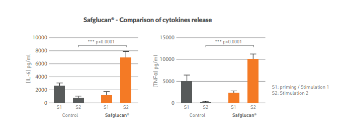 Durante este ensayo, se demostró que Safglucan®, en comparación con el control, aumentaba en gran medida la liberación de citoquinas IL-6 y TNFα, activando una respuesta inmune.